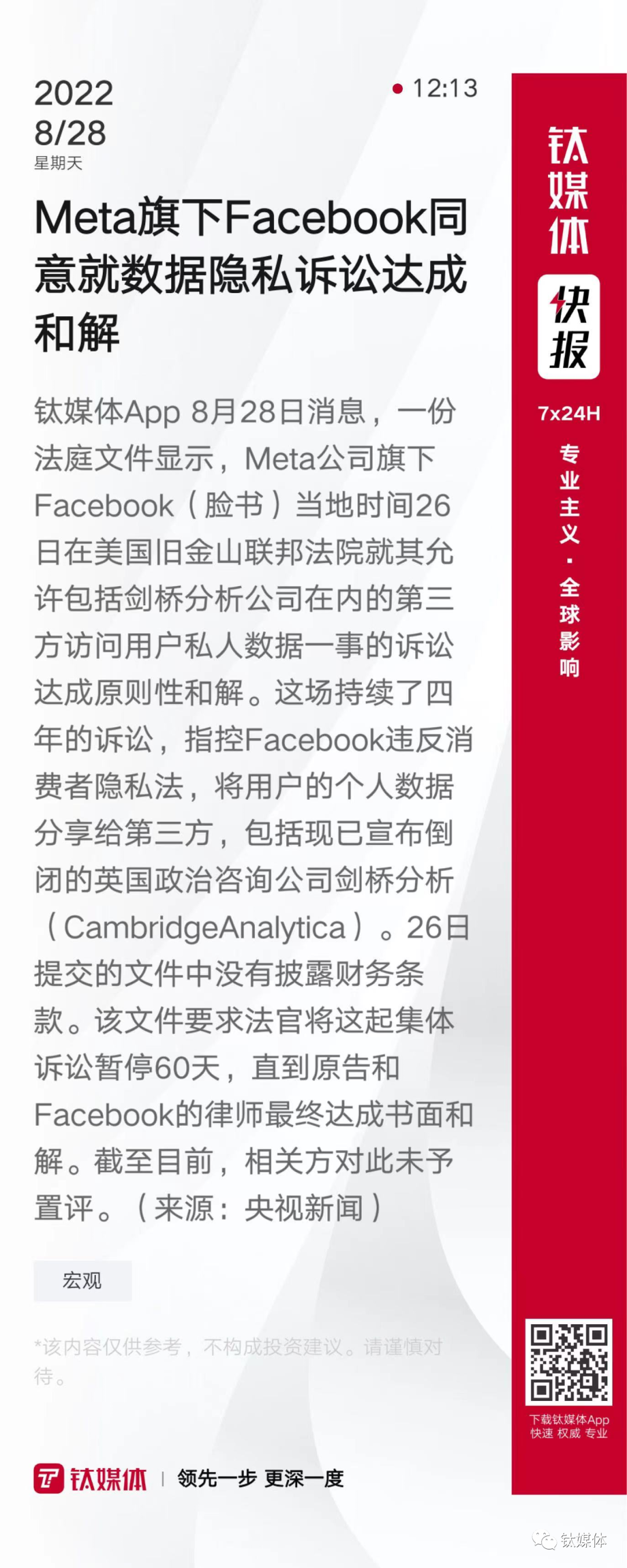 【Meta旗下Facebook同意就数据隐私诉讼达成和解】