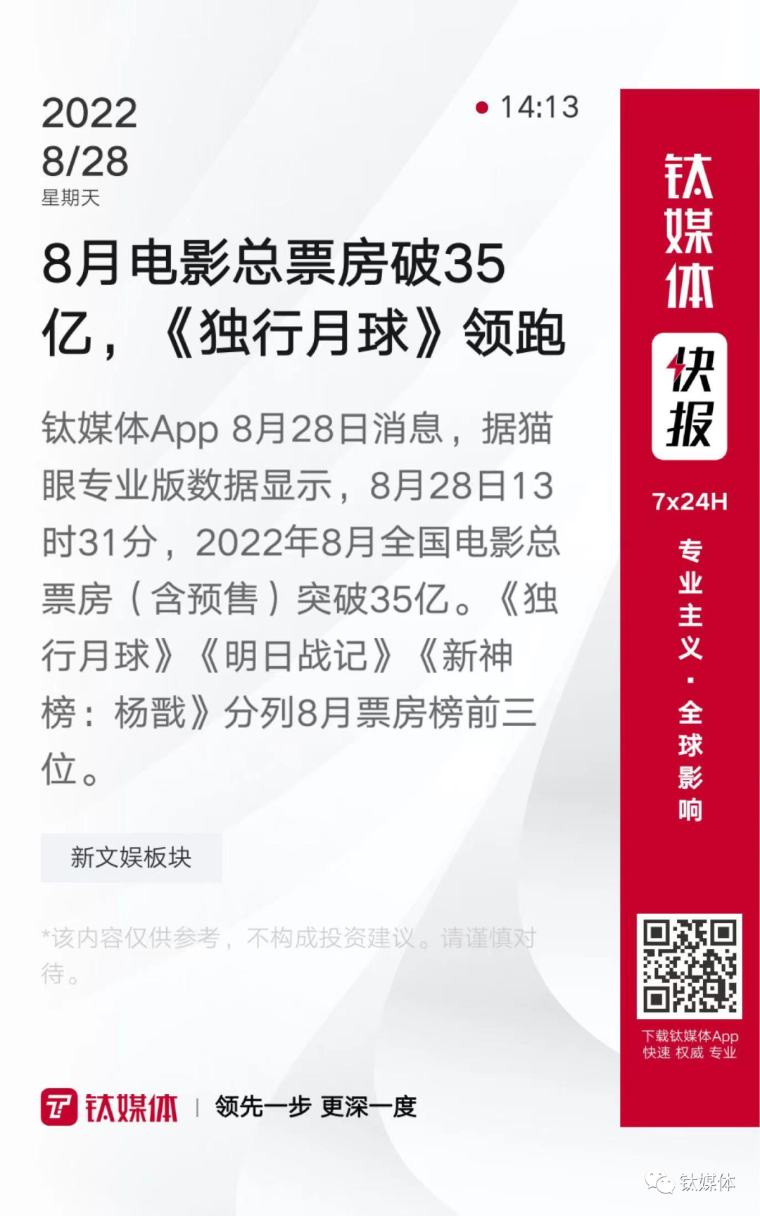 【8月电影总票房破35亿,《独行月球》领跑】