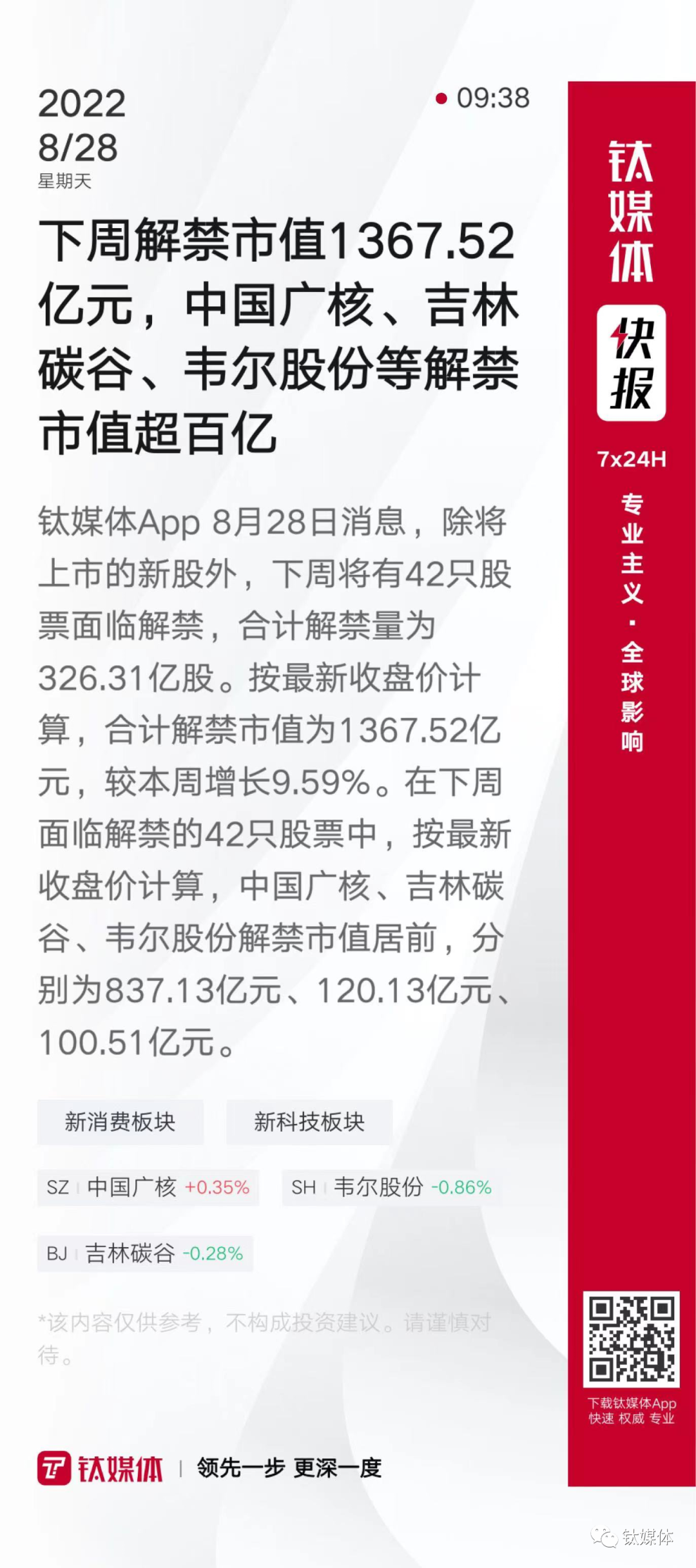 【下周解禁市值1367.52亿元,中国广核、吉林碳谷、韦尔股份等解禁市值超百亿】