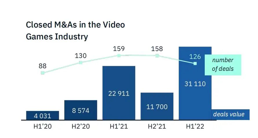 2022上半年的并购活动出现了容易引起争论的结果,一方面,交易数量的减少意味着并购活动的兴趣降低(从159降至126),另一方面,即便是不把已公布的微软收购动视暴雪687亿美元算进来,上半年的并购活动总额也已经达到311亿美元新高,同比增幅36%。