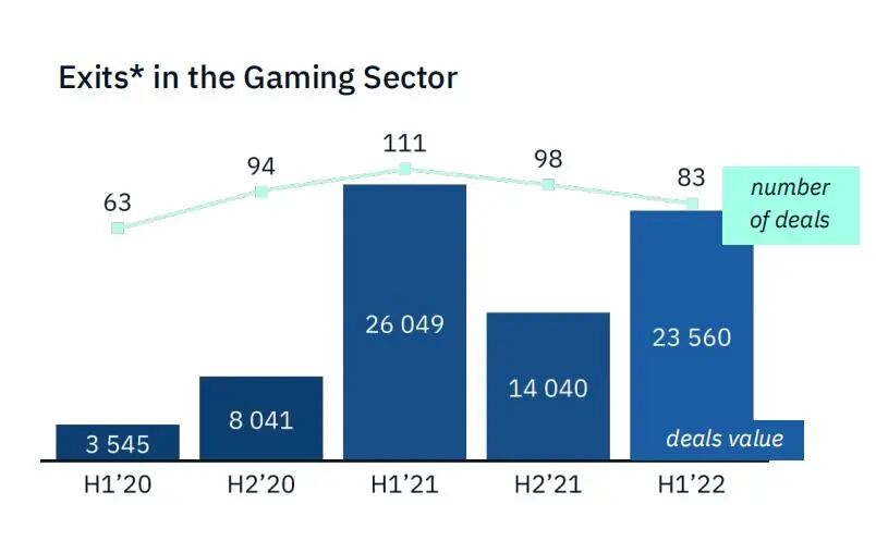 尽管有Take-Two收购Zynga这样的巨额并购(127亿美元)打底,但游戏公司并购总额仍旧略低于去年同期,从260亿美元降至236亿美元(同比-10%),交易数量则从111笔降至83笔(同比减少25%)。加上公开市场表现不佳,并购几乎成为了资本退出活动的唯一方式。