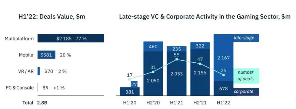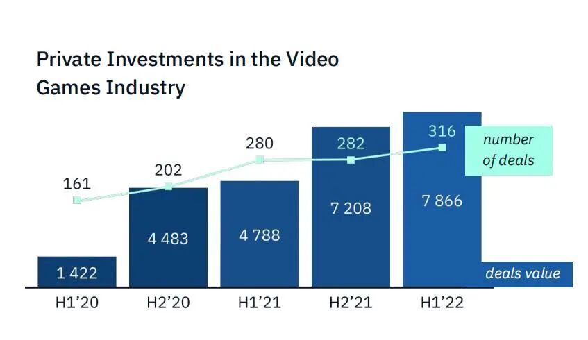 随着2022年过去了一半,私募交易额再次打破纪录,316笔交易总额达到79亿美元,意味着增长稳定,是2021上半年(48亿美元)的1.6倍和2020上半年(15亿美元)的5.5倍。环比来看,2022上半年也超过了2021下半年(282笔交易72亿美元),意味着尽管在艰难的时刻,投资者对于游戏业投入依旧坚定。