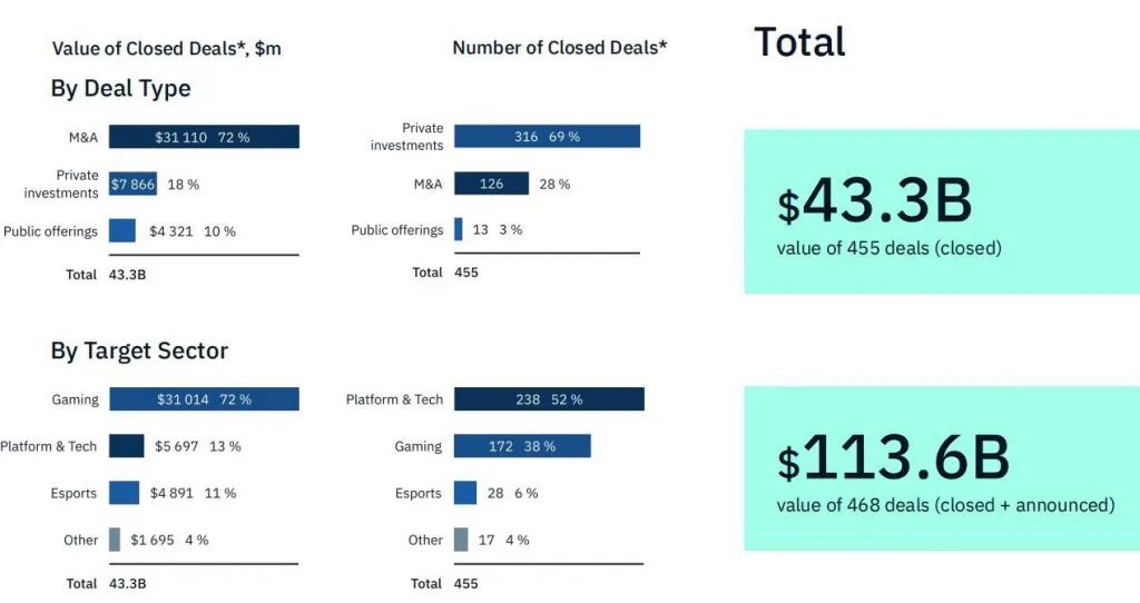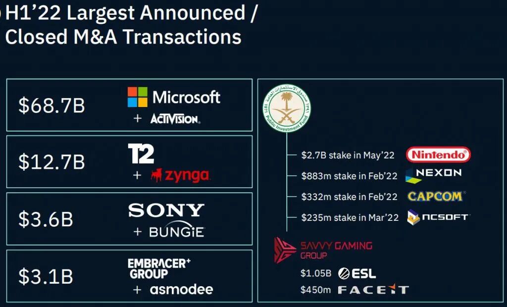 当然,这并不是过分乐观的理由,因为71%收入都是由5宗超级交易贡献:Zynga以127亿美元被Take-Two收购、Embracer Group斥资31亿美元收购Asmodee、沙特公共投资基金(PIF)27亿美元拿到任天堂少数股份、Joffre Capital(22亿美元)购买Playtika少数股权,以及Sumo Group被腾讯13亿美元收入囊中。