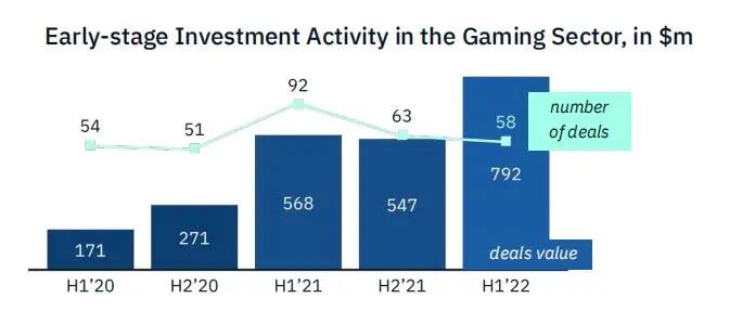 另外,更多的资本开始在更早期阶段介入游戏行业,早期VC投资占据了38%的交易总额(30亿美元),比2021年同期增长了26%。