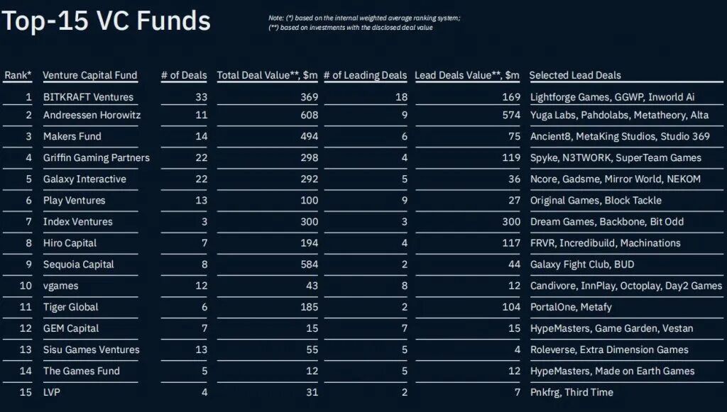 头部15家风投基金通过170多笔交易,为游戏业内公司注入了超过36亿美元资金(2021同期为60多笔交易、11亿美元)。第一名仍然由BITKRAFT Ventures占据,该公司通过33起交易投入3.69亿美元,其中18笔交易是该公司领投,前三名另外两家是Andreessen Horowitz(6.08亿美元、11笔交易)和Makers Fund(4.94亿美元、14笔交易)。