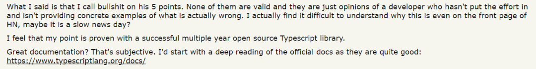 然而,本周 redux-saga 的工程师 Eric Bower 却在一篇博客中提出了不同意见,他站在库开发者的角度,直言“我很讨厌 TypeScript”,并列举了五点理由。这篇博客发布后,随即引发了赞同者和反对者的激烈讨论,其中,反对者主要认为文中的几点理由只能作为开发人员的意见,而且并没有提供证明实质性问题的具体例子。