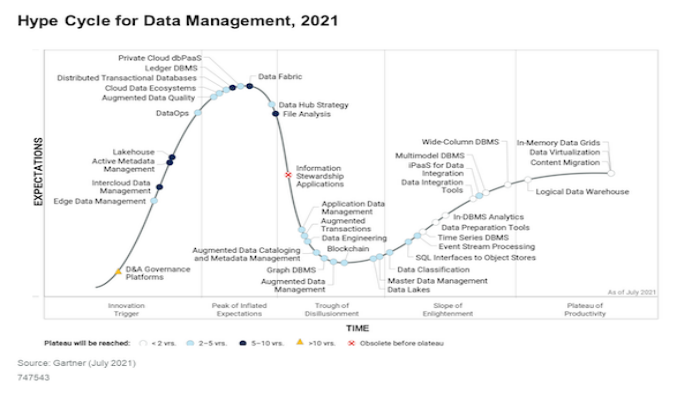 在 2018 年的 Gartner 数据管理软件技术成熟度曲线中,DataOps 第一次出现在“Innovation Trigger”初始阶段。在 2021 年的曲线中,DataOps 已经快速发展到“Peak of Inflated Expectation”边缘了。同时,硅谷已经出现了一批以 DataOps 理念为核心打造数据产品的创业公司并得到了风险投资的大力支持,比如以集成开发为核心的 FiveTran 和 AirBytes,以 SQL 开发管理为核心的 DBT, 以调度为核心的 Astronomer 等等。