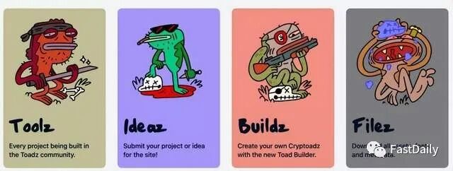 当用户购买了一个赋予完整商业权利的NFT时,用户实际上购买的是一份 IP 许可, 这个社区中参与者会为这个 IP 的现在与未来感到兴奋,当这样的情况真正出现时, NFT的投资行为就不再是单纯地对 NFT 的价格玩着猜大小的游戏,而是对 NFT 进行了再价值创造,就像是在一块空地按照用户的意愿筑起个性的建筑一样 。Cryptoadz就是这样,基于CC0的特性,Cryptoadz的社区为用户设立了国库,鼓励用 户在Cryptodz的基础上不断创造衍生项目,通过提案的方式达到社区自治的目的,目前来看,社区的自治以及holder的创作氛围很好,在平台上面大家可以随意发挥 创造力,如图,在衍生项目——toadztoolz的主页上,分别有工具(Tools)、想法 ( Ideas)、建设(Builds)、文件(Files)四个板块供用户来创造。