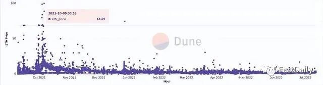 2021年彼时的新项目GREMPLIN的CrypToadz在9月亮相后,并在第一周售出价值 约 1770 万美元的NFT,此后二级市场一直起伏不定,在10月份迎来CrypToadz了第 一次爆发,其系列中售价最高为 300 ETH,在出售时为105万美元,而这位卖家在 不到一个月前仅以 1.5 ETH( 5100美元)的价格购买了这个NFT。