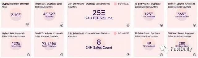 CrypToadz 于2021年 9 月 8 日以每个 0.069 ETH 的价格推出,很短的时间内, CrypToadz就进入了 NFT 项目的上层梯队,