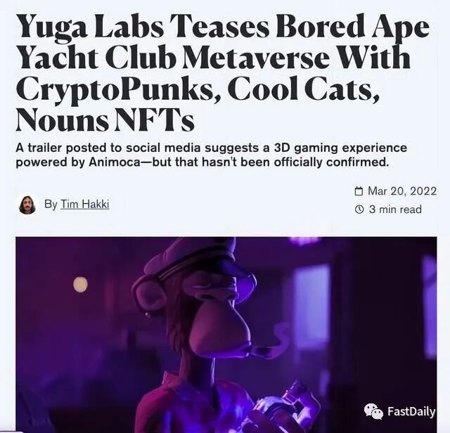 2022年4月30日,BAYC母公司Yuga Labs公司宣布推出全新元宇宙项目Otherside以 及专为该游戏设计的全新NFT——Otherdeed,该NFT将作为元宇宙游戏Otherside中 虚拟土地的凭证,如果你看过该公司最新发布的游戏预告片,会发现无聊猿BAYC、 变异猿MAYC 、CryptoPunks 、Meebits ( Yuga Lab最新收购的NFT项目), 以及Cool Cats 、World of Women 、Nouns 、CrypToadz破天荒实现了大同框。