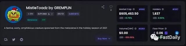 CrypToadz发布后,随着项目发展,CrypToadz开始利用项目本身CC0的特性充实自己的社区以及生态系统,如图可以看到,截至目前MistleToadz市值60万美元,地板 价0.06ETH。