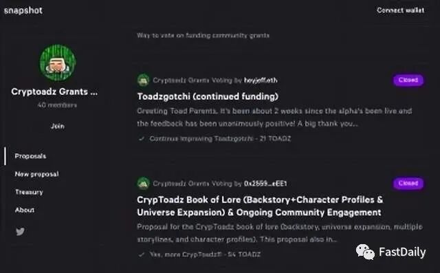 CrypToadz为社区建立的提案机制,社区成员根据投票流程提交快照提案,社区成员根据所需资金(预算)、主要概念 、项目当前发展程度 、路线图 、为CrypToadz贡献的价值 、团队成员等几个维度进行叙述,提交的项目社区会在1周的时间内进行投票审核,最后符合条件的项目会最终收到国库的拨款。