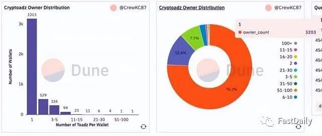从Cryptoadz的持有数据来看,CrypToadz的NFT分别状况与BAYC类似,都呈现出几 个大户集中持仓,散户均匀分布的情况,从2021发售到目前,Cryptoadz的持有 量在逐渐趋向集中。