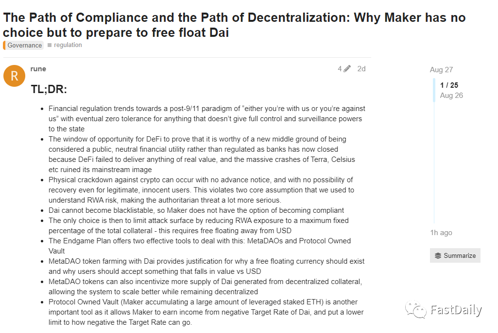 金融监管趋向于极端时,将所有金融活动分为两个选择:要么你是完全合规的、受监管的银行,要么你是恐怖分子。需要注意的是,这是一种趋势,而不是非黑即白的现实,这意味着显然有很多金融活动没有作为一家完全由政府控制的银行进行监管——但随着时间的推移,这种趋势是一种方式,金融自由将受到侵蚀,只要这种趋势仍然存在,就永远不会增加。DeFi 证明它值得被视为公共、中立的金融公用事业而不是像银行那样受到监管的新中间立场的机会之窗现在已经关闭,因为 DeFi 未能提供任何真正有价值的东西,从本质上讲,Terra 崩溃的那一刻确实是我们应该意识到我们根本不可能说服公众认为加密应该与其他金融服务区别对待的那一刻。因此,加密不仅没有产生任何有用的东西,而且加密的主流意识围绕着诸如 Terra、Celsius 和其他加密骗局等灾难,这些骗局摧毁了无辜的普通人的信任,加密货币也无法树立正面的形象。对加密货币的物理打击可以在没有事先通知的情况下发生,即使对于合法、无辜的用户也没有恢复的可能性。这违反了我们用来理解风险加权资产风险的两个核心假设,使威权威胁更加严重。第一个因素是,任何试图夺取 RWA (风险加权资产(RWA)被用来将银行必须拥有的最低资本数量与银行放贷活动(和其他资产)的风险概况联系起来。银行承担的风险越大,就需要更多的资金来保护储户。)或打击加密货币弱点的尝试,例如黑名单或抵押品冻结,都将提前发出电报,以便让无辜和合法的用户有时间做出反应。当时的想法是,如果我们不遵守他们的监管制度,政府不仅会打击 Maker 并对无辜人民造成广泛伤害,他们还会简单地禁止 Maker 依赖他们的法律制度。结果证明这是错误的,因为在 TC 制裁案中,它一直保密,直到陷阱出现,无辜用户(幸运的是少量)将他们的 USDC 冻结在龙卷风现金智能合约中。第二个因素是这样一种想法,即假如RWA 抵押品被冻结或没收,无辜的用户也有一些途径可以收回他们的钱,例如电子黄金价值访问计划。Dai 不能被列入黑名单,因此 Maker 无法选择合规。Maker必须选择去中心化的道路,这也是 Dai 的意图和目的。就像 Dai 的最初设计一样,选择去中心化的道路意味着为 Dai 可能不得不自由浮动的可能性做准备。原因很简单:去中心化路径意味着将Dai的攻击面限制为物理威胁,特别是RWA 抵押品占总投资组合的百分比。在计划中,Maker在 Eagle Stance 期间将此限制设置为 25%(在应用保险和防御措施之前),这是协议将采用的策略,但目前尚不清楚是否真的会进行镇压。保证对 RWA 敞口进行硬性限制的唯一方法是允许 Dai 自由流通,因为对 Dai 的过度需求可能无法通过完全去中心化的资产(如 ETH)支持的额外供应来满足。处理这种不平衡并防止挂钩破裂的唯一方法是引入负目标利率,这将导致Dai 的价格从 1 美元自由浮动到较低的汇率,从而推动了 Dai 的需求并增加了 Dai 的供应,因为使用 ETH 等去中心化的金库生成它变得更便宜。这可能是一个很难接受的现实,但不幸的是,没有办法绕过它。Dunning-Kruger 试图在无法获得与美元挂钩的 RWA 抵押品的情况下保证与 1 美元挂钩,这只会以更糟糕的痛苦和灾难告终,例如 Terra 崩盘。所以Maker唯一的选择就是做好准备,尽一切可能让它成为Maker能够生存的过渡,如果Maker真的打对了牌,它最终可能会成为Maker一直在等待的机会。唯一的选择是通过将 RWA 暴露于总抵押品的最大固定百分比来限制攻击面——这需要从美元自由浮动。Endgame Plan 提供了两种有效的工具来处理这个问题:MetaDAO和 Protocol Owned Vault。最重要的可用工具是 MetaDAO。让人们接受自由浮动价格和递减率,使他们随着时间的推移以美元计价贬值的唯一方法是什么?你必须给他们别的东西作为回报。事实证明,虽然权力下放几乎只有缺点,但人们真正关心的是一个切实的好处。这不仅仅是任何好处,而是首先将大多数人带入加密领域的最强大的东西:创建代币的能力。正如 Endgame Plan 帖子中所描述的,区块链代币的创建是迄今为止最强大的元工程形式,事实上它是如此强大,以至于政府也认识到了这种力量,并努力关闭并控制它。使用去中心化货币,创建由token管理的去中心化企业运营的去中心化经济成为可能,并且无论当局多么愿意,它都不能被关闭或控制——只要你有一个真实的,实际上支撑它的去中心化货币。另一个主要工具是 Protocol Owned Vault - 让 Maker 自己积累大量杠杆质押 ETH 的策略,从而成为完全去中心化、超额抵押 Dai 的净发行人。这有两大优势:首先,它允许 Maker 利用自然 Dai 需求产生的负利率,而 MetaDAO 收益农业的存在实际上会加剧这种情况(尽管如此,它必须存在,因为它提供了基本的核心理由为什么 Dai 如果不与美元挂钩,它甚至还有任何意义)。应该很容易看出,对每年收益率超过 5% 的资产拥有大量杠杆敞口,然后拥有大量本身可以产生的债务(例如由于负利率,每年 5% 使其以美元计算随着时间的推移而自动下降。其次,更重要的是,拥有一个协议拥有的保险库可以让制造商更直接地控制和影响负利率的允许程度,帮助稳定自由浮动的Dai,并保护用户免受不确定性,即随机受到极端负利率的打击,因为一些需求或供应冲击。基本上,如果利率足够低,Maker就可以介入,允许协议拥有的保险库采取非常高的杠杆,以首先稳定利率,使其不再下降,但同时也收获