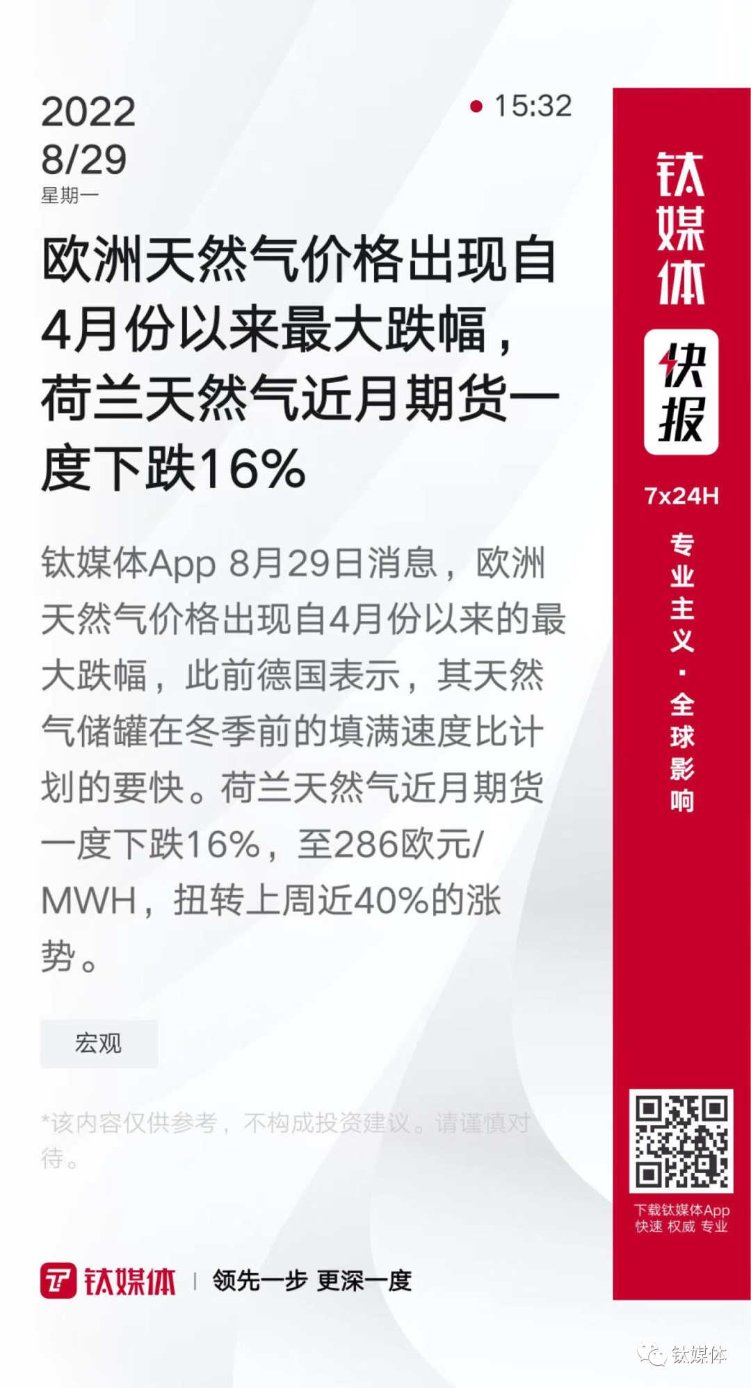 【欧洲天然气价格出现自4月份以来最大跌幅,荷兰天然气近月期货一度下跌16%】