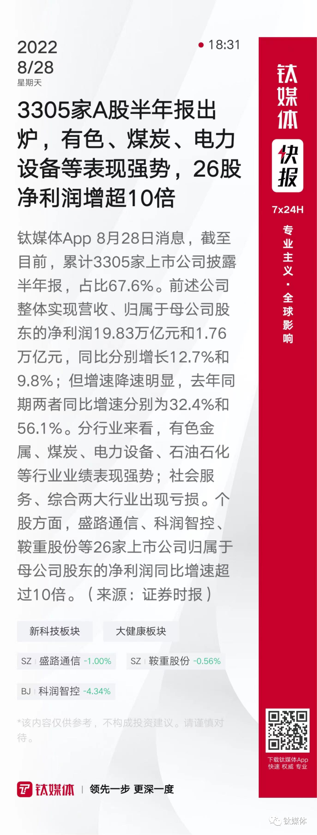 【3305家A股半年报出炉,有色、煤炭、电力设备等表现强势,26股净利润增超10倍】