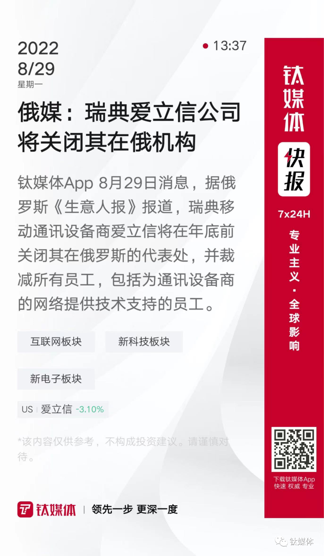【俄媒:瑞典爱立信公司将关闭其在俄机构】