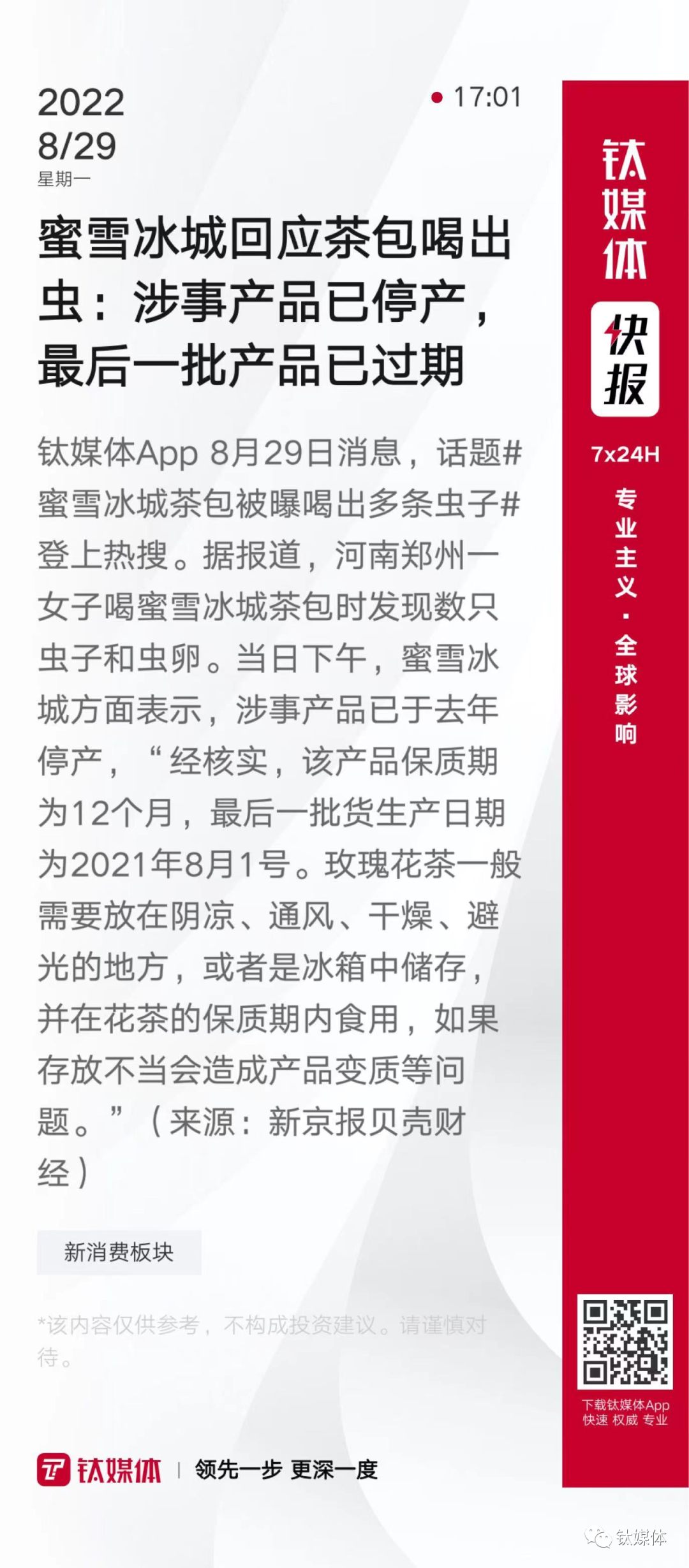 【蜜雪冰城回应茶包喝出虫:涉事产品已停产,最后一批产品已过期】