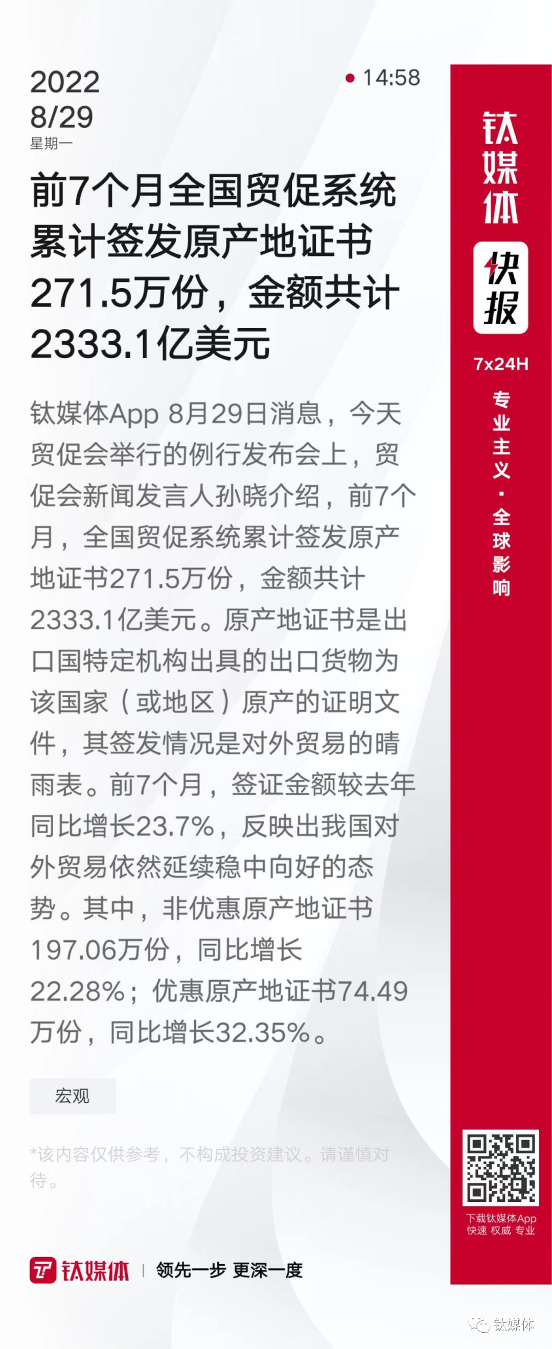 【前7个月全国贸促系统累计签发原产地证书271.5万份,金额共计2333.1亿美元】