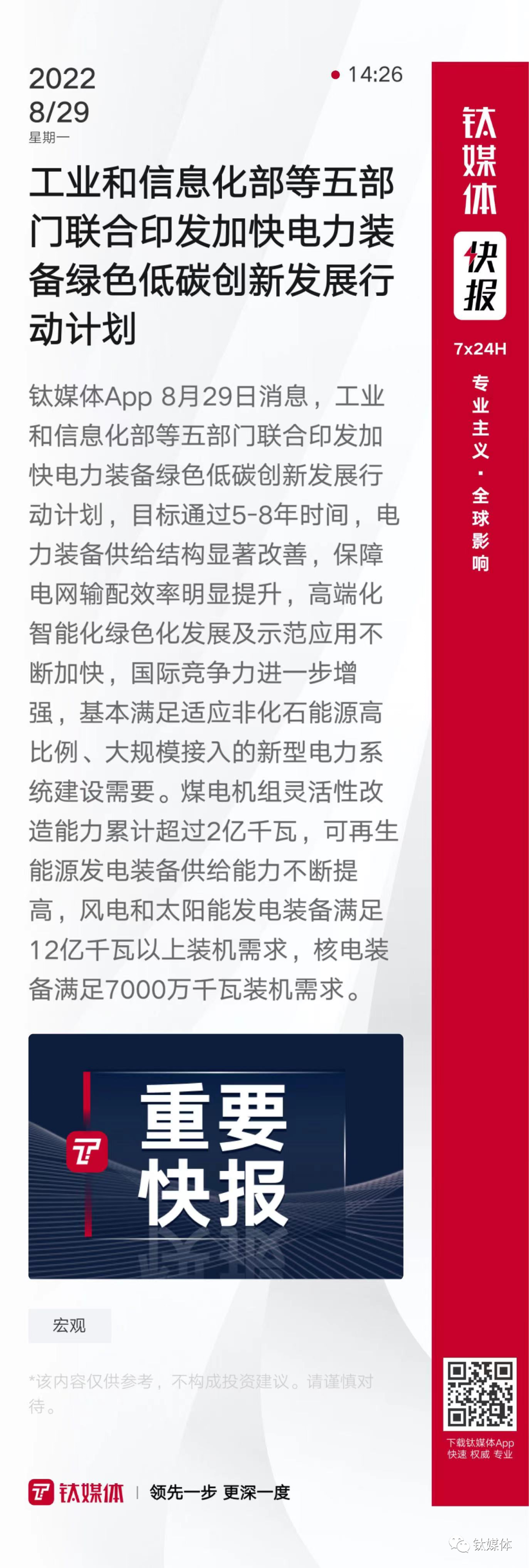 【工业和信息化部等五部门联合印发加快电力装备绿色低碳创新发展行动计划】
