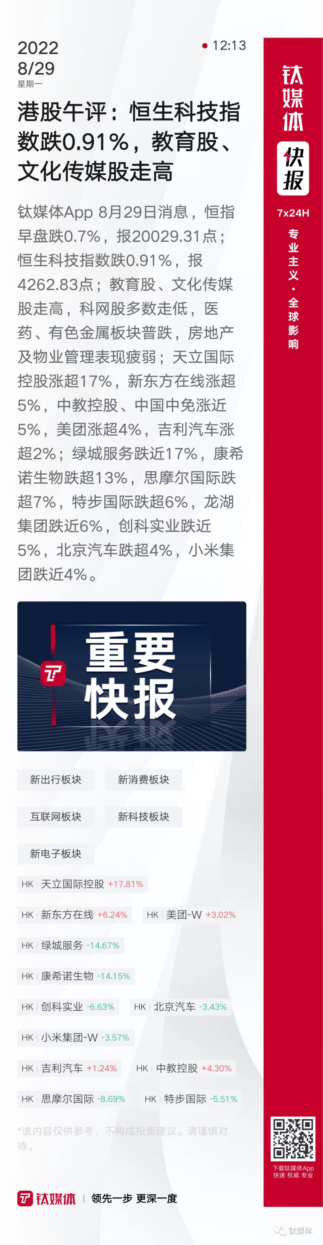 【港股午评:恒生科技指数跌0.91%,教育股、文化传媒股走高】
