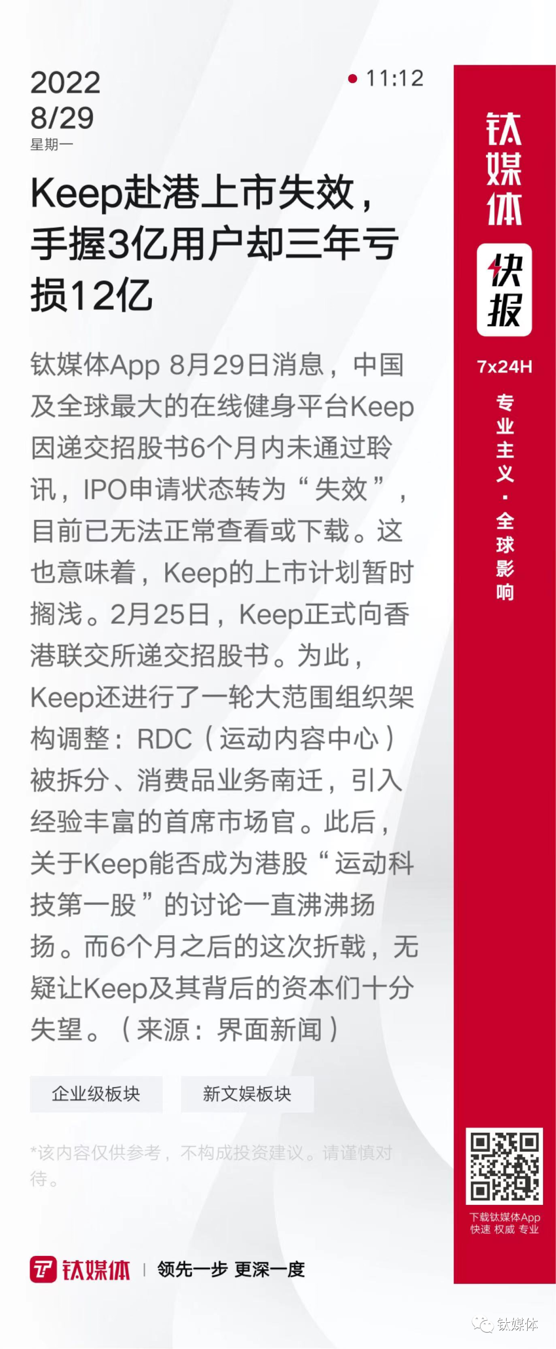 【Keep赴港上市失效,手握3亿用户却三年亏损12亿】