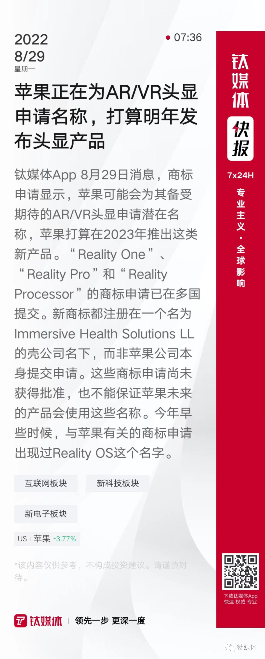 【苹果正在为AR/VR头显申请名称,打算明年发布头显产品】