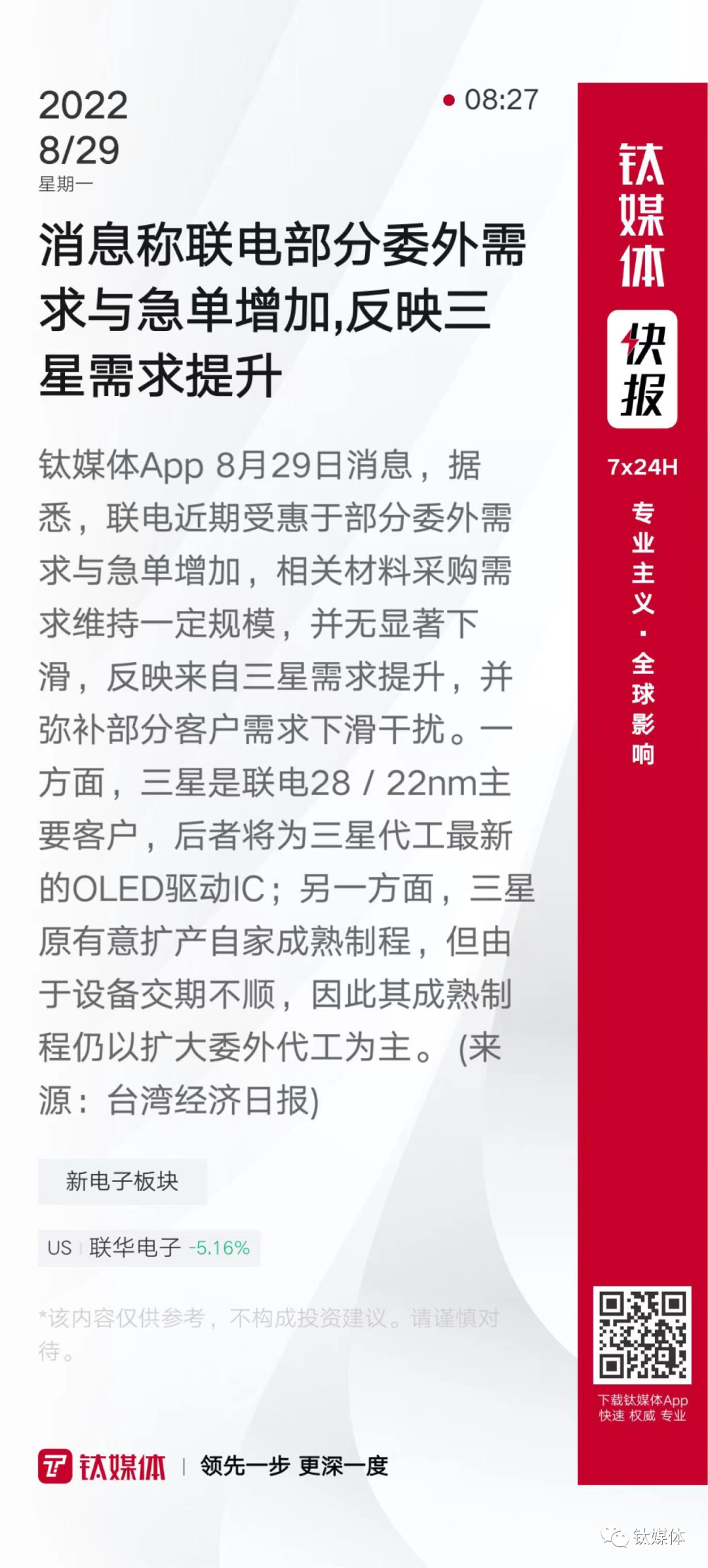 【消息称联电部分委外需求与急单增加,反映三星需求提升】