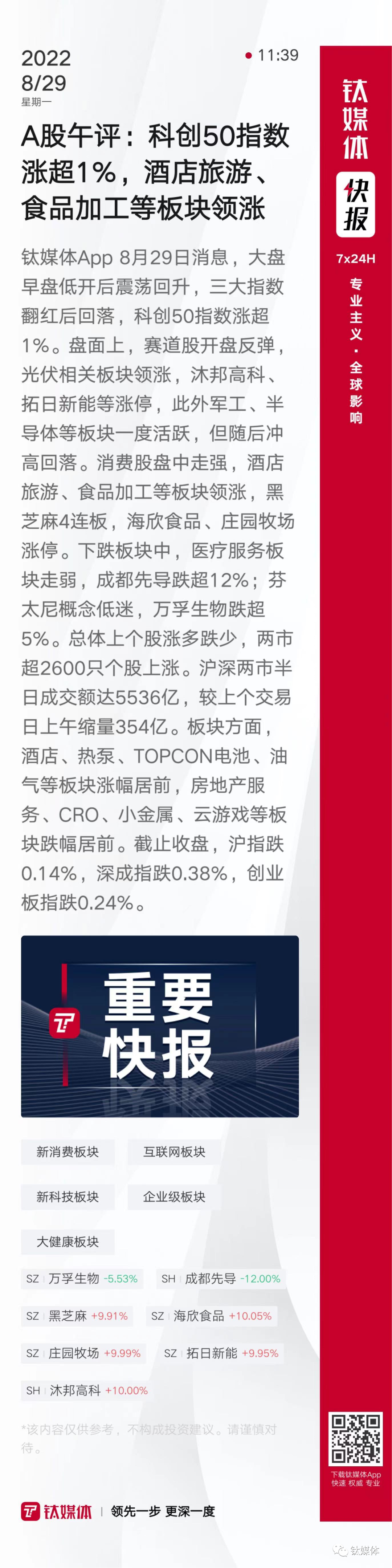 【A股午评:科创50指数涨超1%,酒店旅游、食品加工等板块领涨】