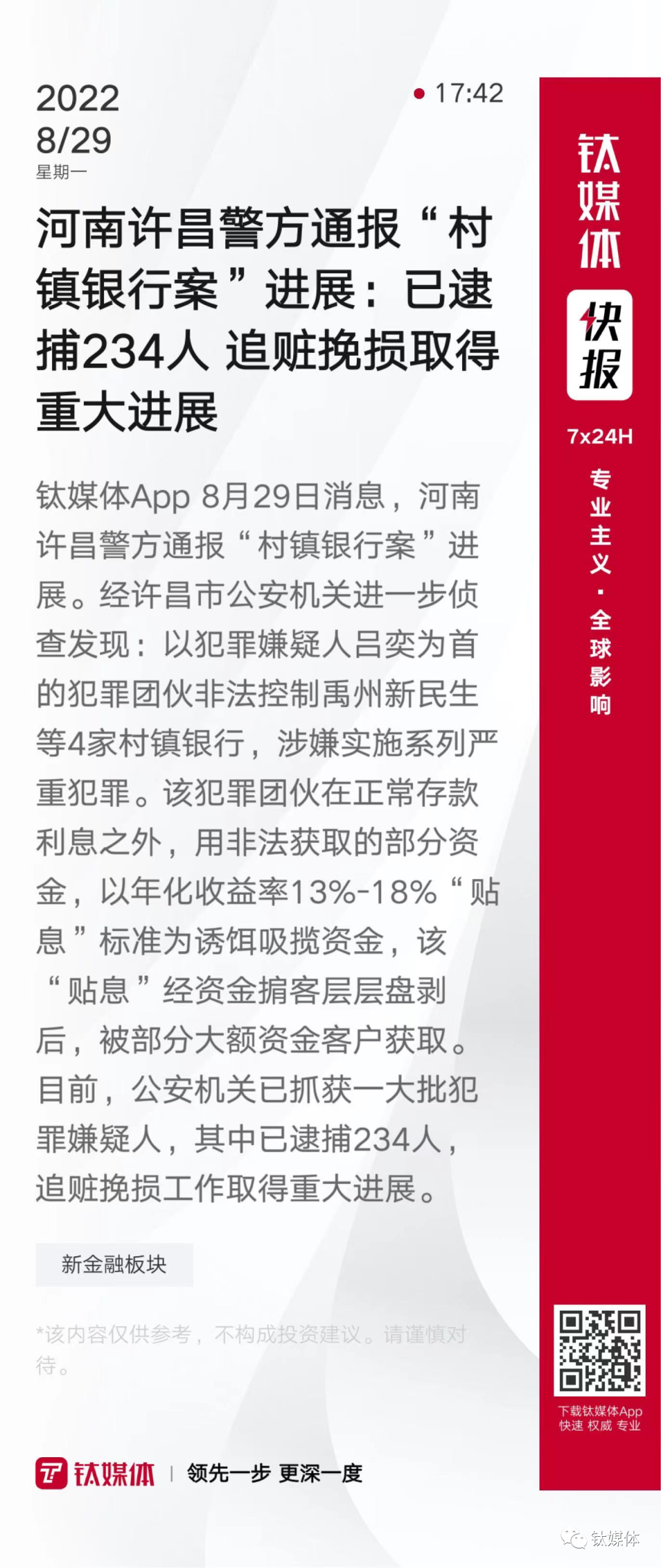 【河南许昌警方通报“村镇银行案”进展:已逮捕234人 追赃挽损取得重大进展】