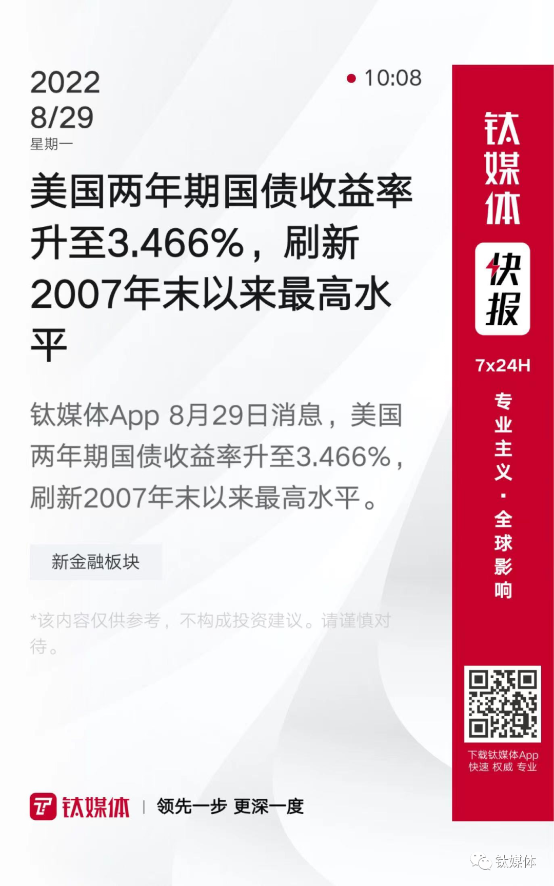 【美国两年期国债收益率升至3.466%,刷新2007年末以来最高水平】