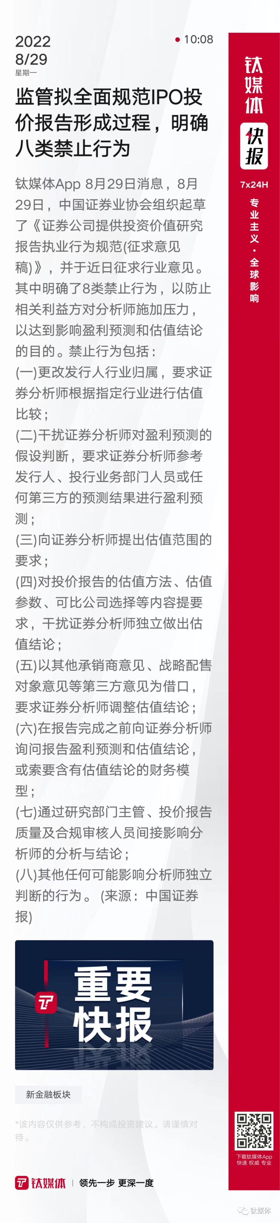 【监管拟全面规范IPO投价报告形成过程,明确八类禁止行为】