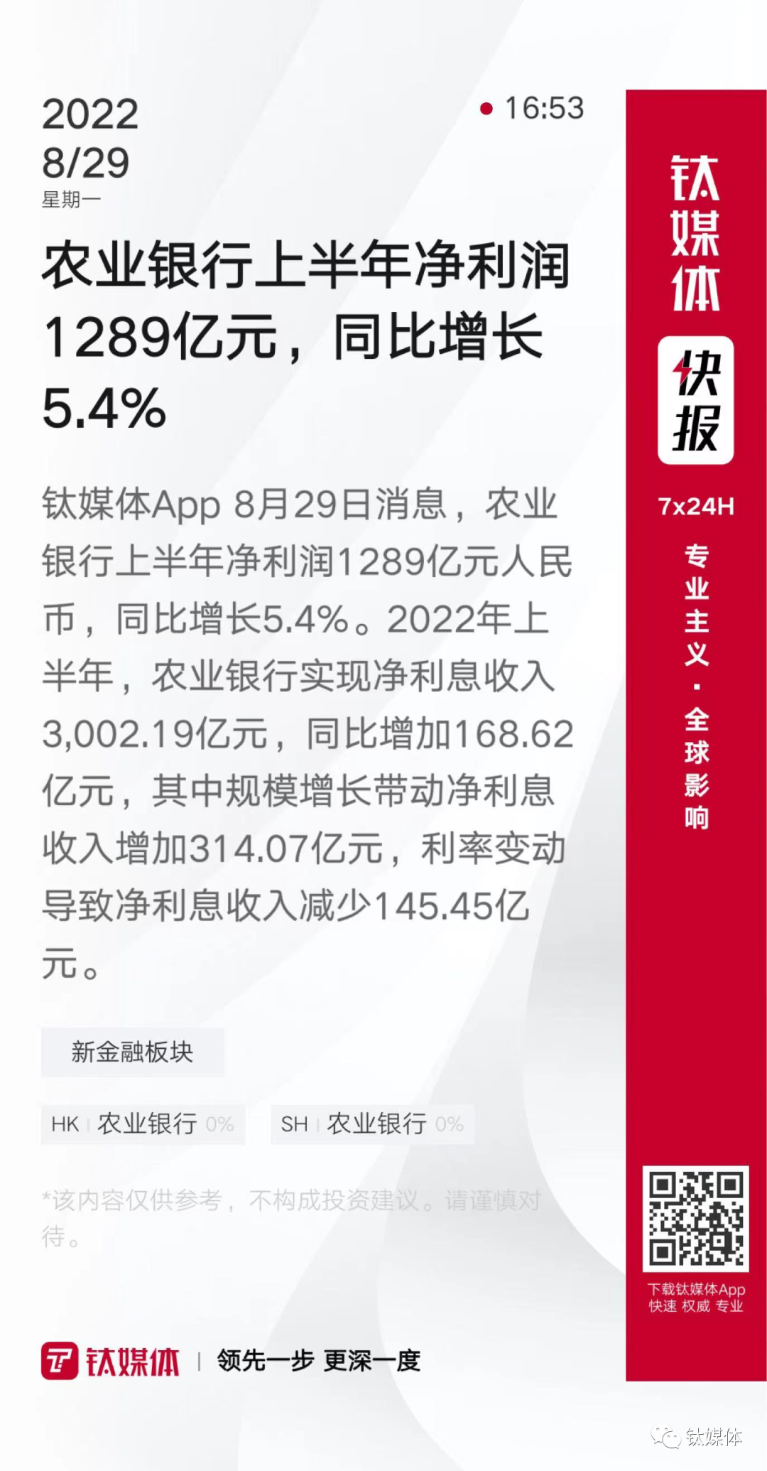【农业银行上半年净利润1289亿元,同比增长5.4%】