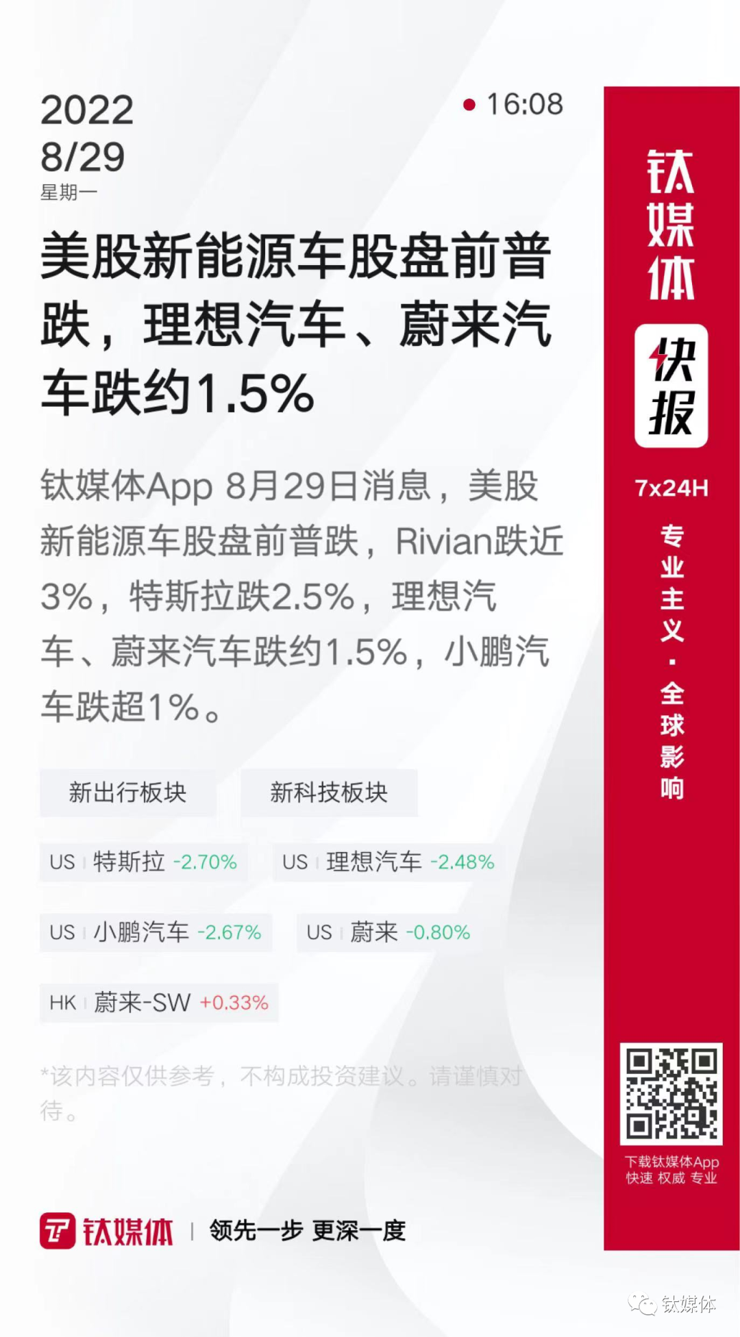 【美股新能源车股盘前普跌,理想汽车、蔚来汽车跌约1.5%】