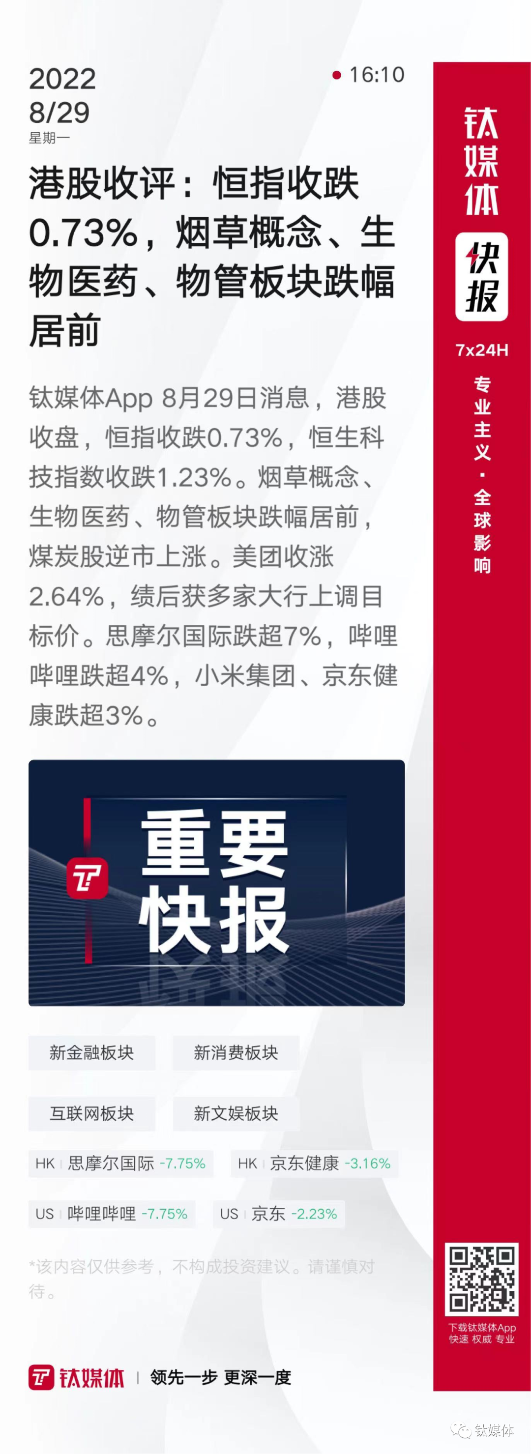 【港股收评:恒指收跌0.73%,烟草概念、生物医药、物管板块跌幅居前】