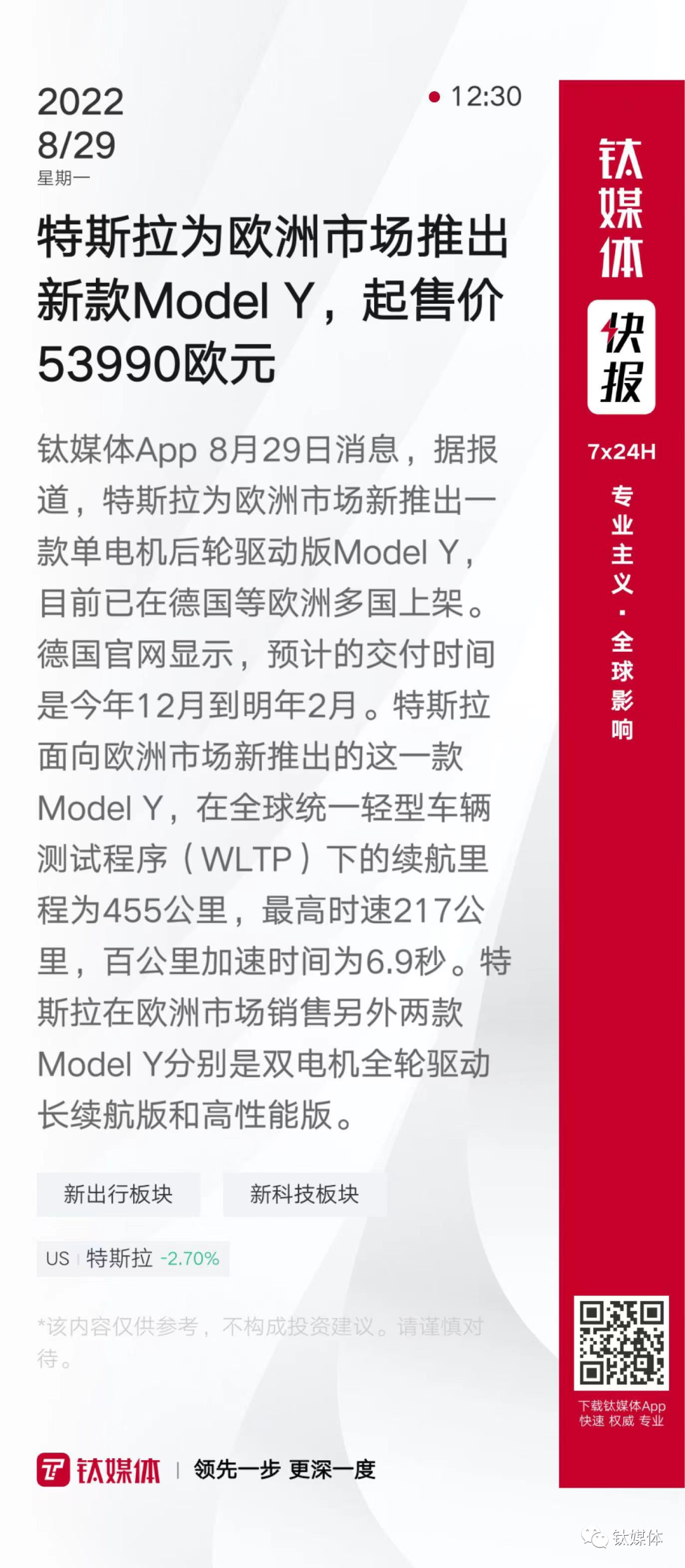【特斯拉为欧洲市场推出新款Model Y,起售价53990欧元】