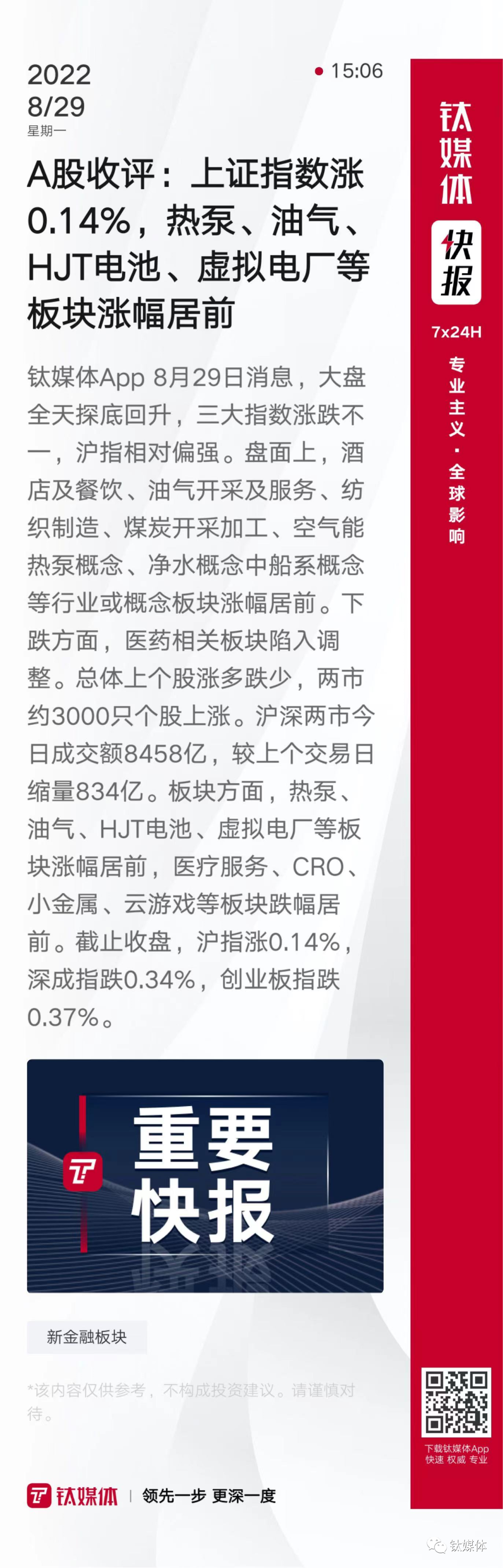 【A股收评:上证指数涨0.14%,热泵、油气、HJT电池、虚拟电厂等板块涨幅居前】