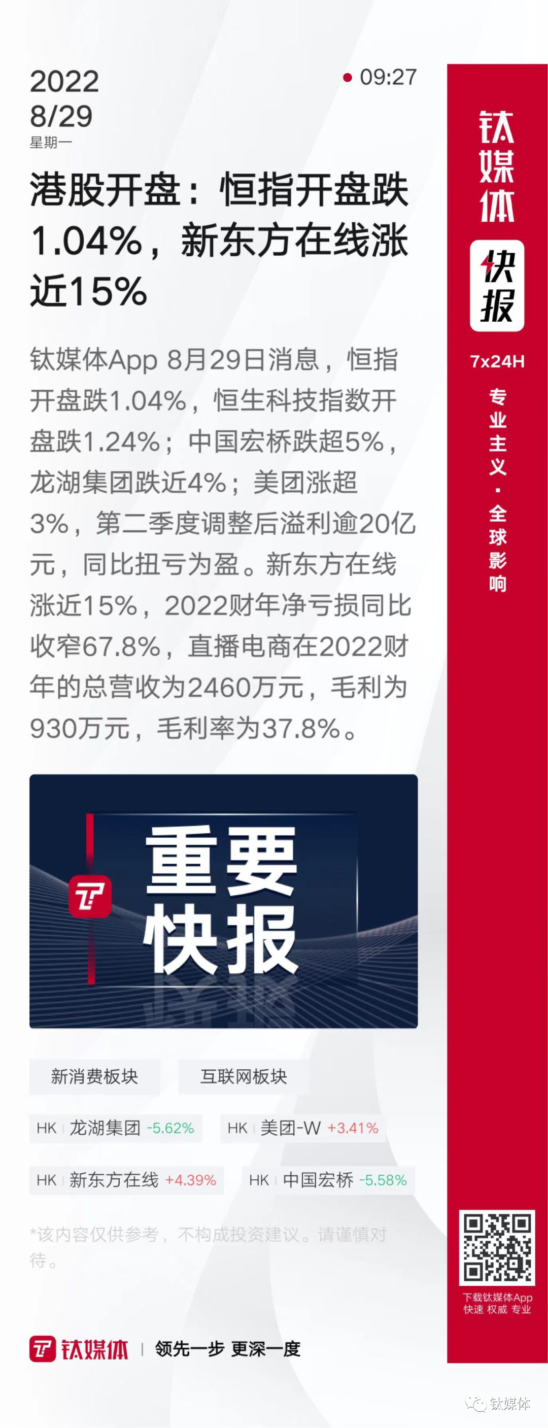 【港股开盘:恒指开盘跌1.04%,新东方在线涨近15%】