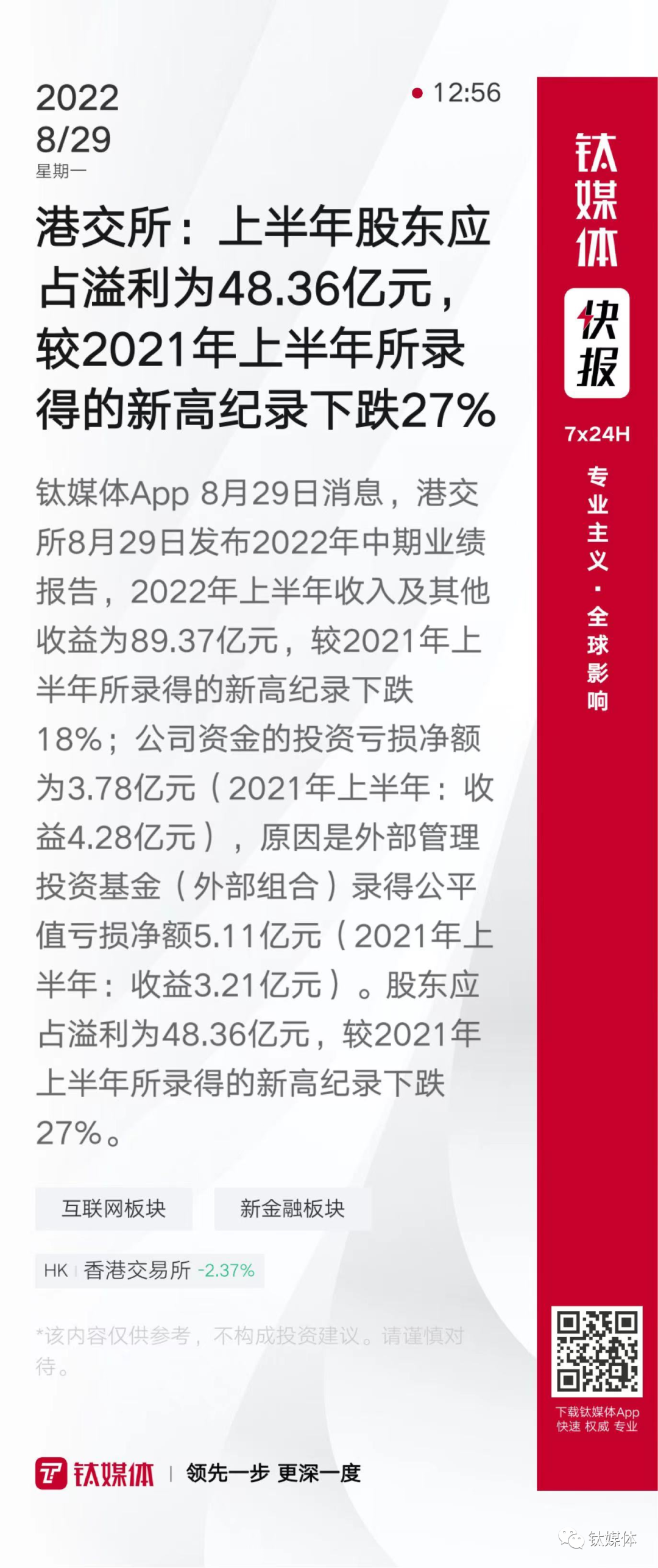 【港交所:上半年股东应占溢利为48.36亿元,较2021年上半年所录得的新高纪录下跌27%】