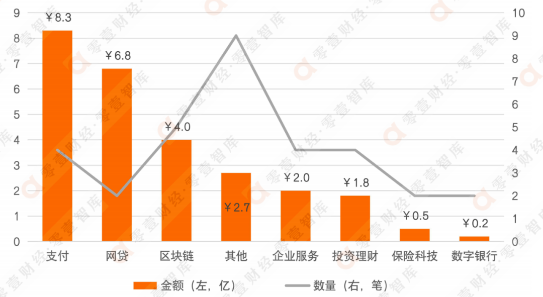 领域来看,仍然是区块链领域最多,达5笔,其次是支付、企业服务和投资理财,均为4笔。支付领域融资金额保持最高,达到8.3亿元,网贷领域总额达到6.8亿元。