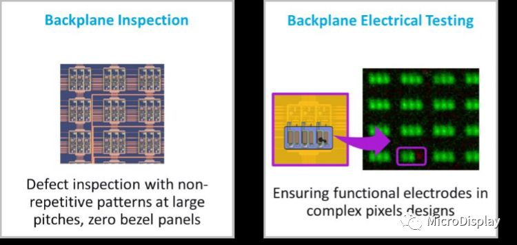 现在切换到背板生产需求,需要提供高品质的背板来进行巨量转移microLED晶粒。首先,我们发现microLED用的背板往往具有相当长的比对间距,且像素图案不具重复性,这给背板的检查带来了极大的冲击,从过去我们习惯使用的像素到像素比对(pixel to pixel)的演算法,升级到晶片到晶片比对(die to die)的演算法,这样极需高速计算能力(HPC)来进行完整的影像处理,以满足更复杂背板设计所需要的缺陷检出灵敏度。