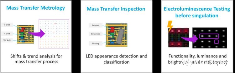 这允许回馈到磊晶制程本身,以改进该制程品质,并向前回馈筛选出磊晶缺陷所导致的缺陷晶粒。其次,我们必须说制造microLED晶粒制程与传统LED制程相比,需要使用相当高的灵敏度水平上进行缺陷检测,然后将这些检测结果再次回馈到巨量转移制程,以允许面板制造商仅使用已知的KGD(Known Good Die)组装显示器。