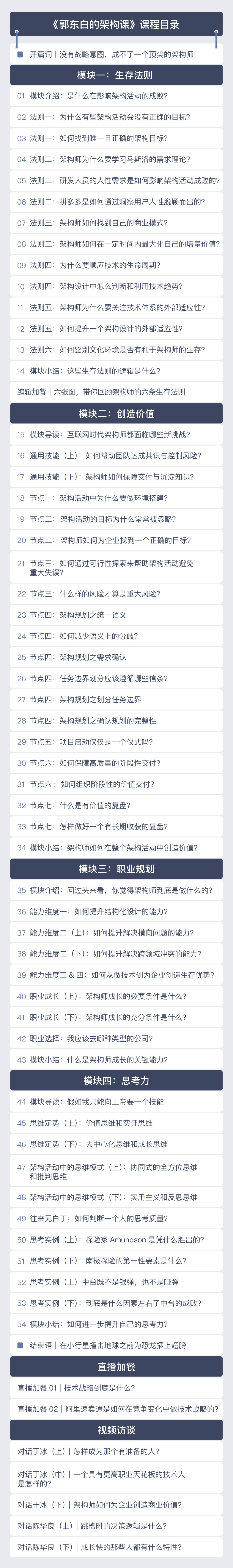 我第三次接触郭东白,是他的专栏《郭东白的架构课》,这个专栏更系统全面地记录了东白原创的架构方法论,包括「架构师的六大生存法则」、「架构活动实施的八个关键节点」、「架构师能力提升的五大关键能力」等等,口碑很好。