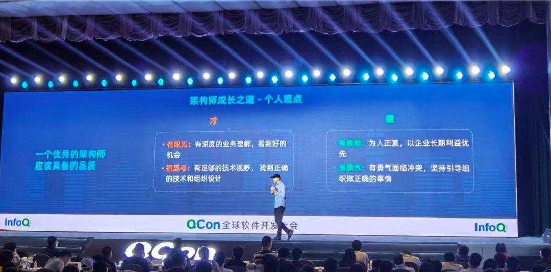 我第二次接触郭东白,是 QCon 大会,他分享《如何成为一名优秀的架构师》。他表示「一个好的架构是被发现的,靠的是高质量的洞察和对真理的持续逼近,架构师应该基于良知为组织持续做出正确判断。」这场演讲非常精彩,讲到“架构师的德包括良知和勇气”时,现场很多观众都把支持、赞同打在了弹幕上。