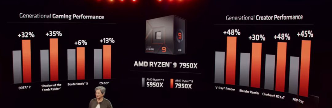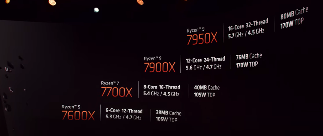 此次发布会,AMD发布了四款锐龙7000系列处理器,分别为R5 7600X、R7 7700X、R9 7900X和R9 7950X,并且宣布将在9月27日开售,与之前爆料的基本一致。AMD锐龙7000系列处理器首发四款型号的参数和价格如下:R5 7600X为6核心12线程,睿频为4.7-5.3GHz,缓存为38MB,TDP为105W,售价约2057.12元人民币。R7 7700X为8核心16线程,睿频为4.5-5.4GHz,缓存为40MB,TDP为105W,售价约2745.12元人民币。R9 7900X为12核心24线程,睿频4.7-5.6GHz,缓存为76MB,TDP为170W,售价约3777.12元人民币。R9 7950X为16核心32线程,睿频4.5-5.7GHz,缓存为80MB,TDP为170W,售价约4809.12元人民币。除此之外,AMD还说明了锐龙7000系列处理器采用了5nm工艺和Zen4架构,官方称IPC提升13%,再加上5.7GHz的频率,单核性能提升了29%。按照AMD的测试数据,AMD锐龙7000系列首发四款型号的Geekbench单核跑分均超过了英特尔当前的旗舰处理器 i9-12900K。AMD将R9 7950X与i9-12900K进行了对比,游戏性能方面,AMD 型号在DOTA2中提升23%;在创作方面,AMD型号在V-Ray上领先63%。除了处理器之外,AMD还公布了适配全新架构芯片的新主板。主板方面,全新AMD Socket AM5平台的新插槽采用1718针LGA设计,支持高达230W TDP的处理器、双通道DDR5内存和新的SVI3电源基础架构,可刚好契合新芯片的功耗需求。AMD Socket AM5还具有PCIe 5.0通道,最多可达24条。据悉,此次AM5系列主板将分为四个等级,X670 Extreme为两根显卡插槽和一根存储器插槽,还提供PCIe5.0支持,带来强大的连接性能和更高的超频性能;X670为一根存储器插槽和一根显卡插槽,并提供PCIe5.0支持(其中显卡插槽支持PCIe5.0为可选项),专为发烧友超频设计;B650拥有支持PCIe 5.0的存储器插槽, 专为高性能用户设计;B650 Extreme可在B650的基础上进行一些超频,可再提高一定的性能。目前AMD已经率先发布了新款处理器,等到英特尔正式发布后,感兴趣的消费者可以对比根据需求选择更适合自己的处理器。