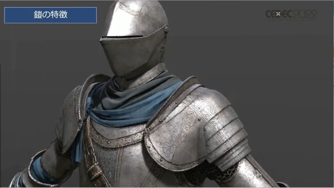 此外,《艾尔登法环》中备受玩家称赞的铠甲也是来自对现实铠甲的研究。在原画中一些没有体现出的原始盔甲的魅力,也通过建模进行了很好的传达。比如考虑到中世纪欧洲的盔甲实际上都是用锤子多次敲击薄铁板以形成三维形状,因此下图中的盔甲建模可以直接被定义为高级骑士专用——这副盔甲上的锤痕已经用锉刀去除,并且施加了精美的装饰。
