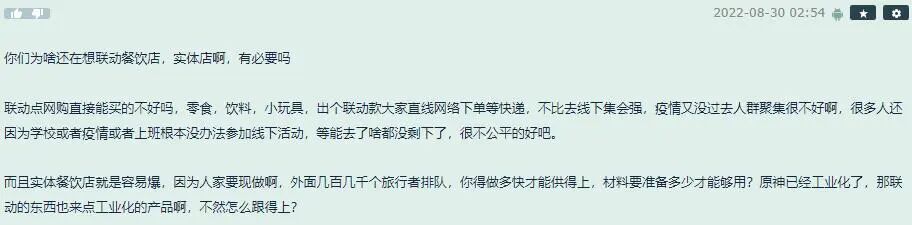 对此,有网友表示,出现这种情况,显然与百胜方面对玩家热情预估不足、缺乏预先准备有关,特别是考虑到去年的联动盛况,更应该对此次人气爆棚的联动有充分的事前认知。而另外一些网友已然开始为米哈游出谋划策:既然线下餐饮接待能力确实有限,不如选择可网购的联动对象,通过国内四通八达的快递物流满足更多玩家参与活动、获得周边的需求。