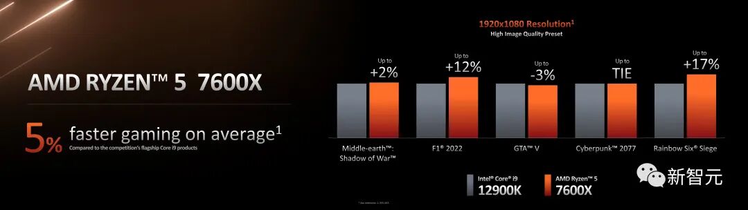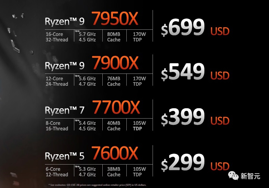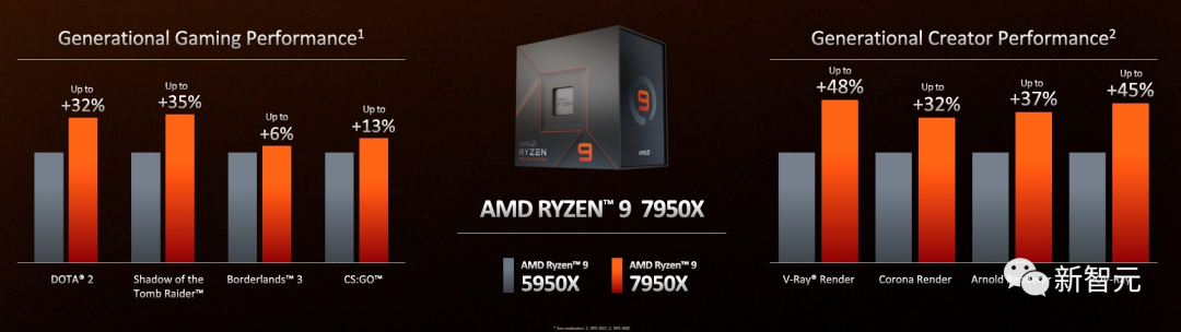 可以看到,与往代Ryzen系列旗舰相比,7950X在频率上有了明显的提升。这也是AMD过去几年来的产品趋势。而且,由于架构改进带来的能效,Ryzen下的频率提升带来的是性能的提升。在单核跑分中,7000系与5000系拉开了比较明显的差距,入门小弟7600X的单核表现已经吊打了前任大哥5950X,战胜英特尔现任旗舰12900K也不在话下。仅不敌英特尔即将发布的旗舰13900K,不过关键还是要看隔壁的新旗舰卖多少钱了。「三弟」7700X的R20单核/多核跑分表现与对比(某蓝厂 ,你有本事开门啊,你有本事别加那么多小核啊~)在多线程应用(如Chaos V-Ray)上,7950X与12900K对比,最高性能优势可达57%,能效优势(每瓦特性能)也高达47%。在游戏性能上,7950X在基准测试中大部分强于英特尔旗舰12900K,其中《DOTA2》+23%,《古墓丽影:暗影》+14%,《无主之地3》打平,CSGO则输了1%。和前任大哥相比,7950X也是提升相当明显,无论是游戏还是渲染任务,提升基本都在30%以上。按照AMD的说法,就连甜品级的7600X,都能和12900K打得有来有回。不得不说,5nm的好处是显而易见的,不管是核心的频率还是功耗,甚至是芯片的尺寸上,AMD的7000系都有了质的飞跃——终于能超过5GHz了!此外,相比Zen3而言,Zen4有着29%的单线程、>35%的多线程以及>25%每瓦性能的增益。台积电的5nm工艺节点配上全新的Zen 4架构,也给7000系带来了13%的IPC提升。不过,这波性能上的提升,主要还是来自更高的时钟频率和更高的TDP。当然,AMD也提到了在AI推理上的提升。但是吧,谁会用AMD做机器学习呢……最后,来个投票吧,您对哪款7000系的CPU最感兴趣?https://wccftech.com/amd-ryzen-7000-zen-4-cpus-official-up-to-16-cores-5-7-ghz-boost-clocks-prices-between-299-699-us-27th-september-launch/https://wccftech.com/roundup/amd-ryzen-7000-zen-4-am5-cpus/