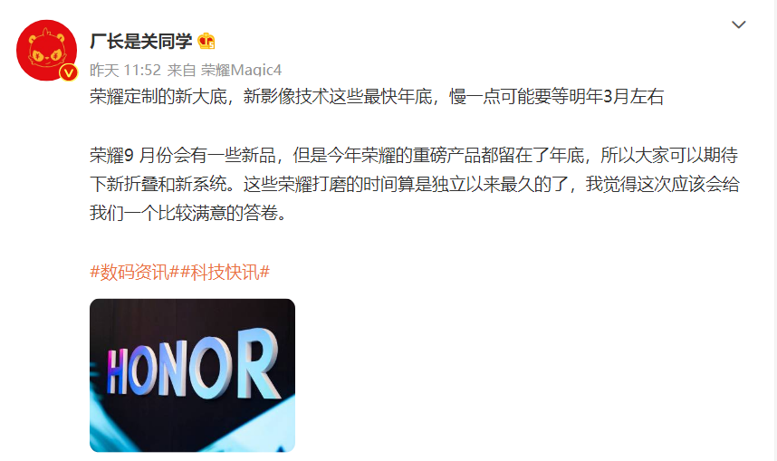 虽然该博主并未透露具体型号,但据推测其指的是主打影像旗舰的荣耀 Magic5 系列手机。据悉,荣耀 Magic 4 Pro后置采用5000万像素广角摄像头(f/1.8 光圈)+5000万像素超广角摄像头(f/2.2 光圈)+6400万像素100倍潜望式长焦摄像头(f/3.5 光圈,OIS防抖)组合。另据数码博主@厂长是关同学 表示,对于荣耀定制的新大底,新影像技术,最快会在年底发布,慢一点则可能要等到明年3 月左右再发布。该博主还透露荣耀的新折叠屏手机会在今年年底发布。此外,该博主在评论区回复网友,荣耀 Magic5会在明年3月左右发布。据博主@旺仔百事通 透露,荣耀Magic V2折叠屏和 Magic5系列均搭载骁龙8Gen2芯片,其中Magic V2折叠屏先发布,预计将在年底前与大家见面。结合目前的爆料,荣耀预计推出两款搭载骁龙8Gen2芯片的新机,其中荣耀Magic V2折叠屏将在年底率先发布,主打影像的Magic5系列预计在明年3月左右发布,感兴趣的朋友可以保持关注。